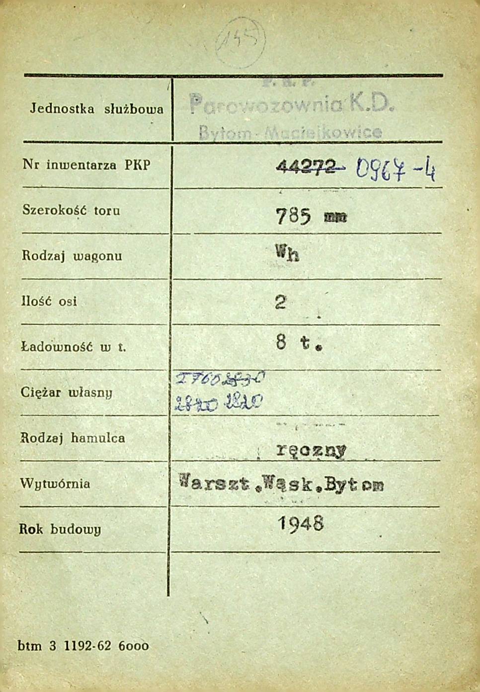 Karta wagonu Górnośląskich Kolei Wąskotorowych |