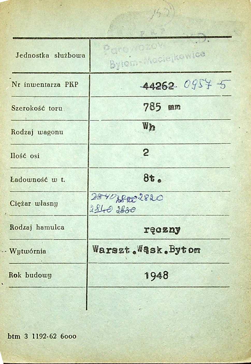 Karta wagonu Górnośląskich Kolei Wąskotorowych |