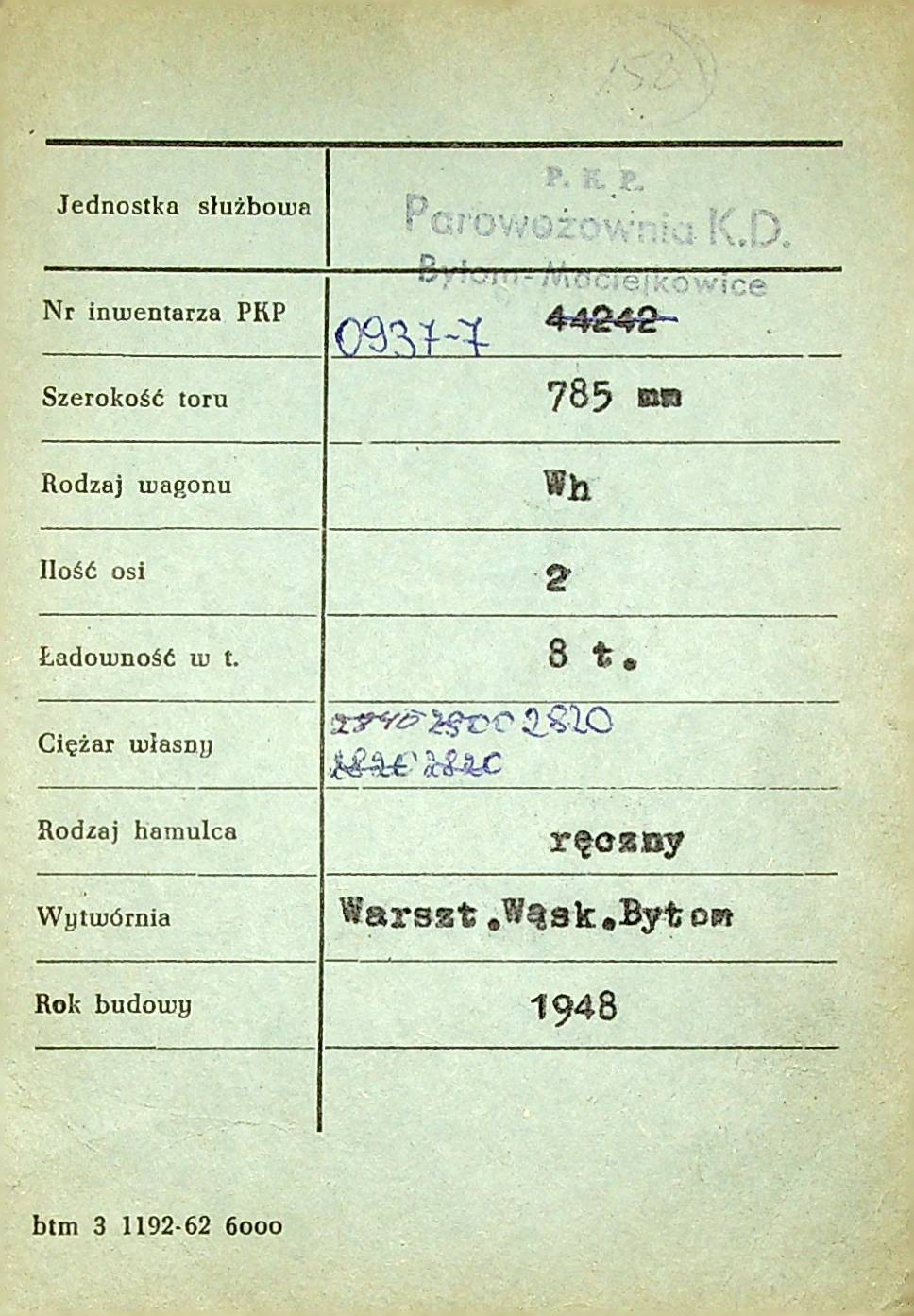 Karta wagonu Górnośląskich Kolei Wąskotorowych |