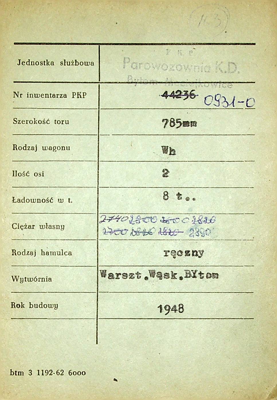 Karta wagonu Górnośląskich Kolei Wąskotorowych |
