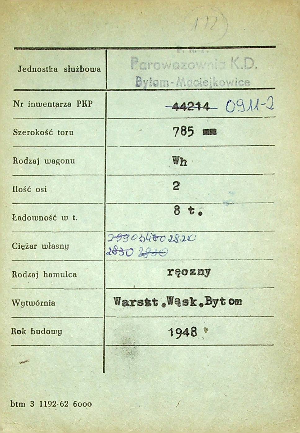 Karta wagonu Górnośląskich Kolei Wąskotorowych |