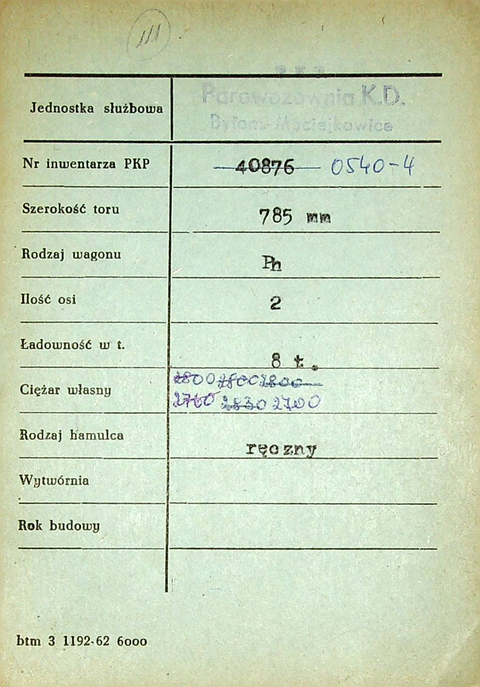 Karta wagonu Górnośląskich Kolei Wąskotorowych |