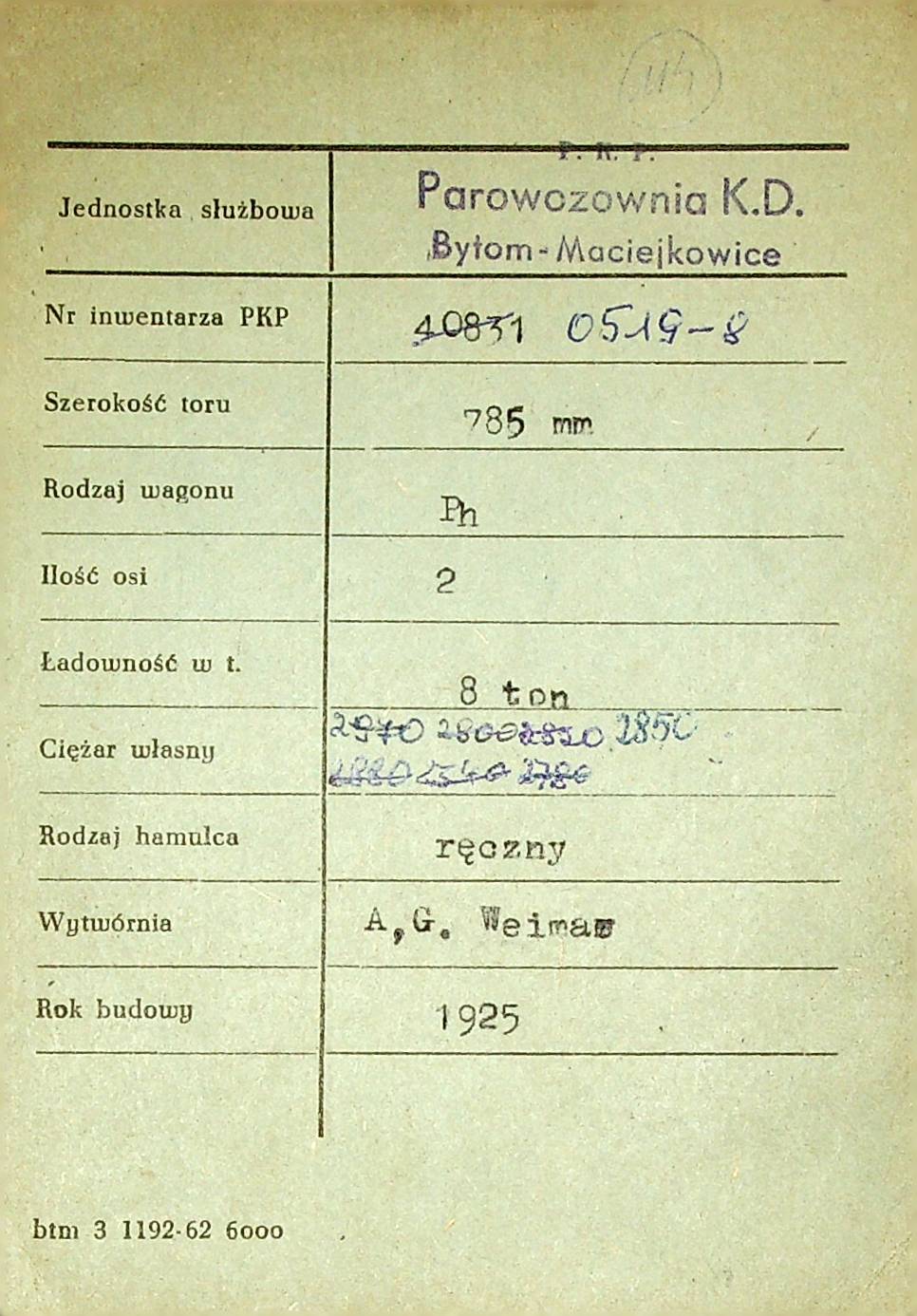 Karta wagonu Górnośląskich Kolei Wąskotorowych |