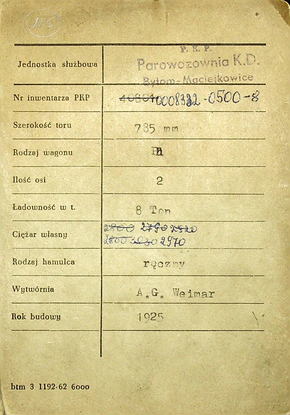 Karta wagonu Górnośląskich Kolei Wąskotorowych |