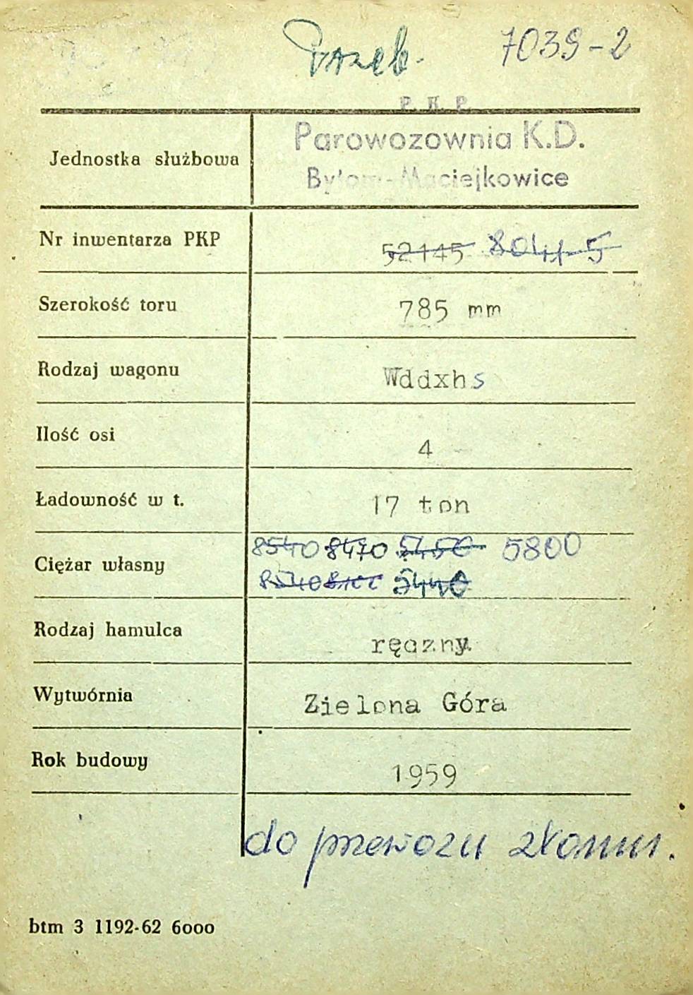 Karta wagonu Górnośląskich Kolei Wąskotorowych |