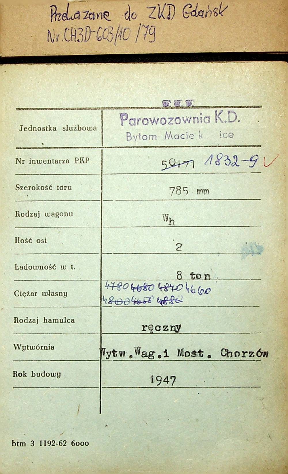Karta wagonu Górnośląskich Kolei Wąskotorowych |