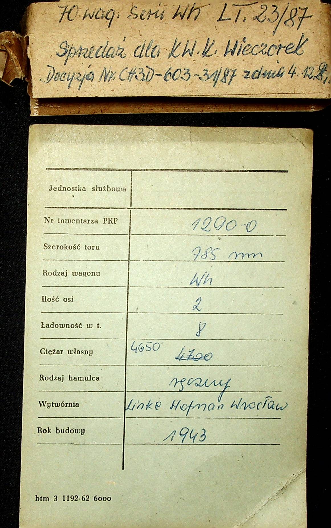 Karta wagonu Górnośląskich Kolei Wąskotorowych |