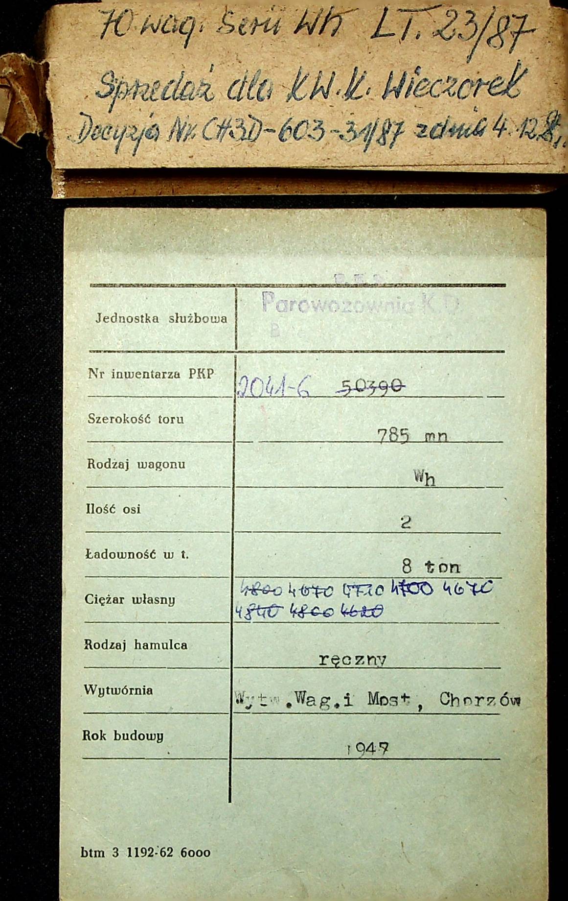 Karta wagonu Górnośląskich Kolei Wąskotorowych |