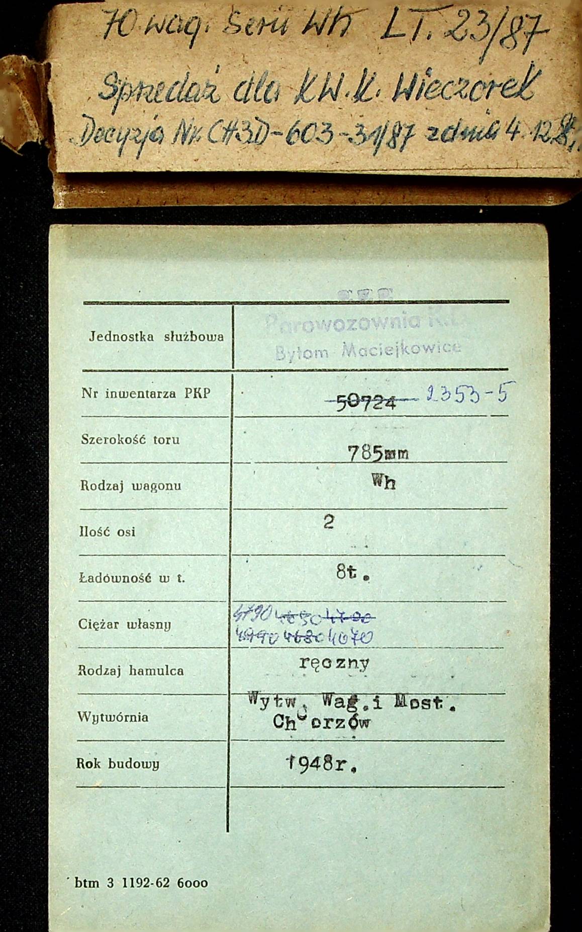 Karta wagonu Górnośląskich Kolei Wąskotorowych |