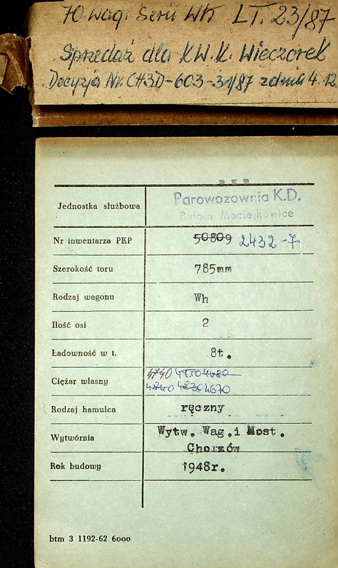 Karta wagonu Górnośląskich Kolei Wąskotorowych |