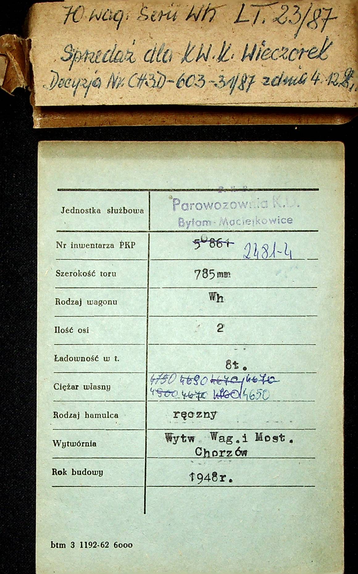 Karta wagonu Górnośląskich Kolei Wąskotorowych |