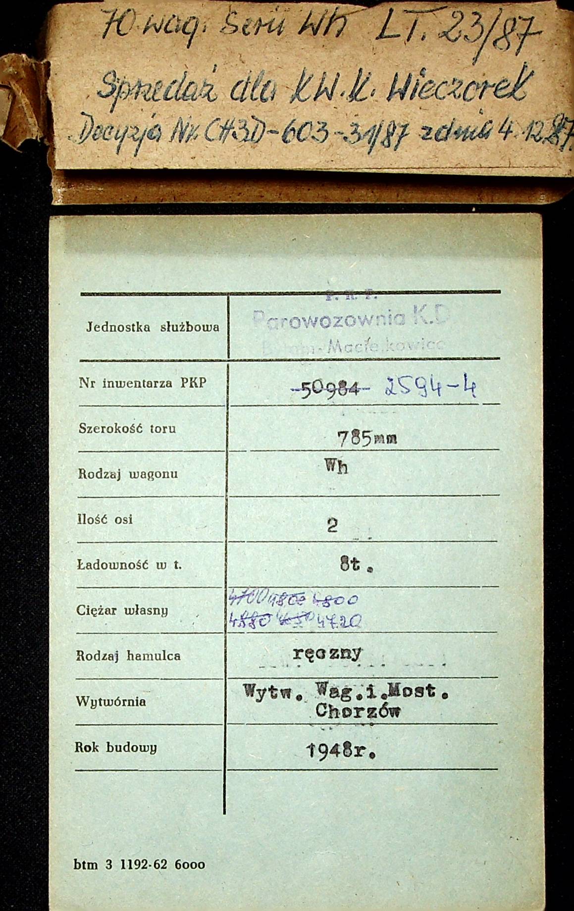 Karta wagonu Górnośląskich Kolei Wąskotorowych |