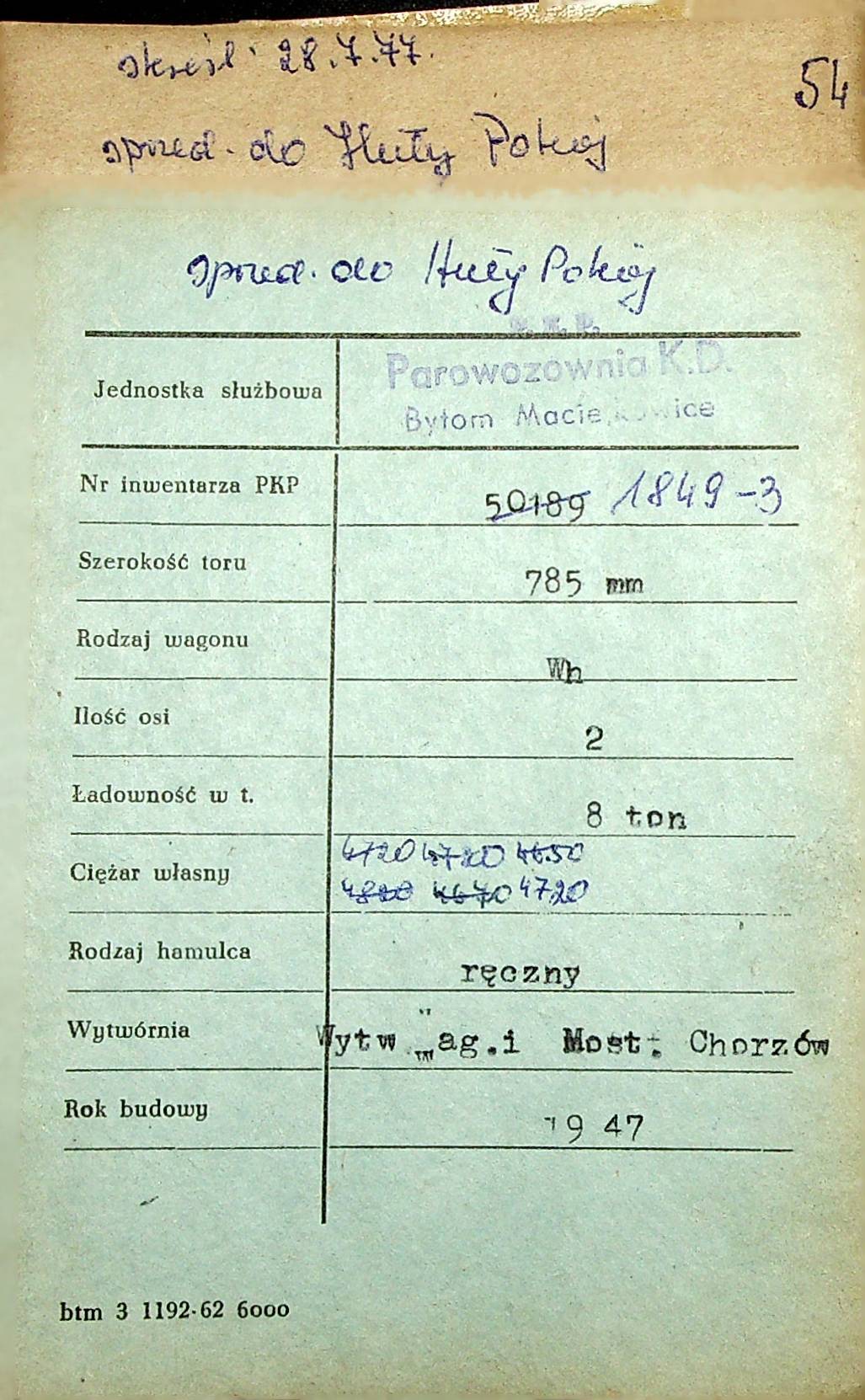 Karta wagonu Górnośląskich Kolei Wąskotorowych |