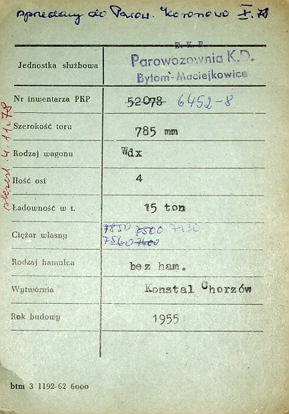 Karta wagonu Górnośląskich Kolei Wąskotorowych |