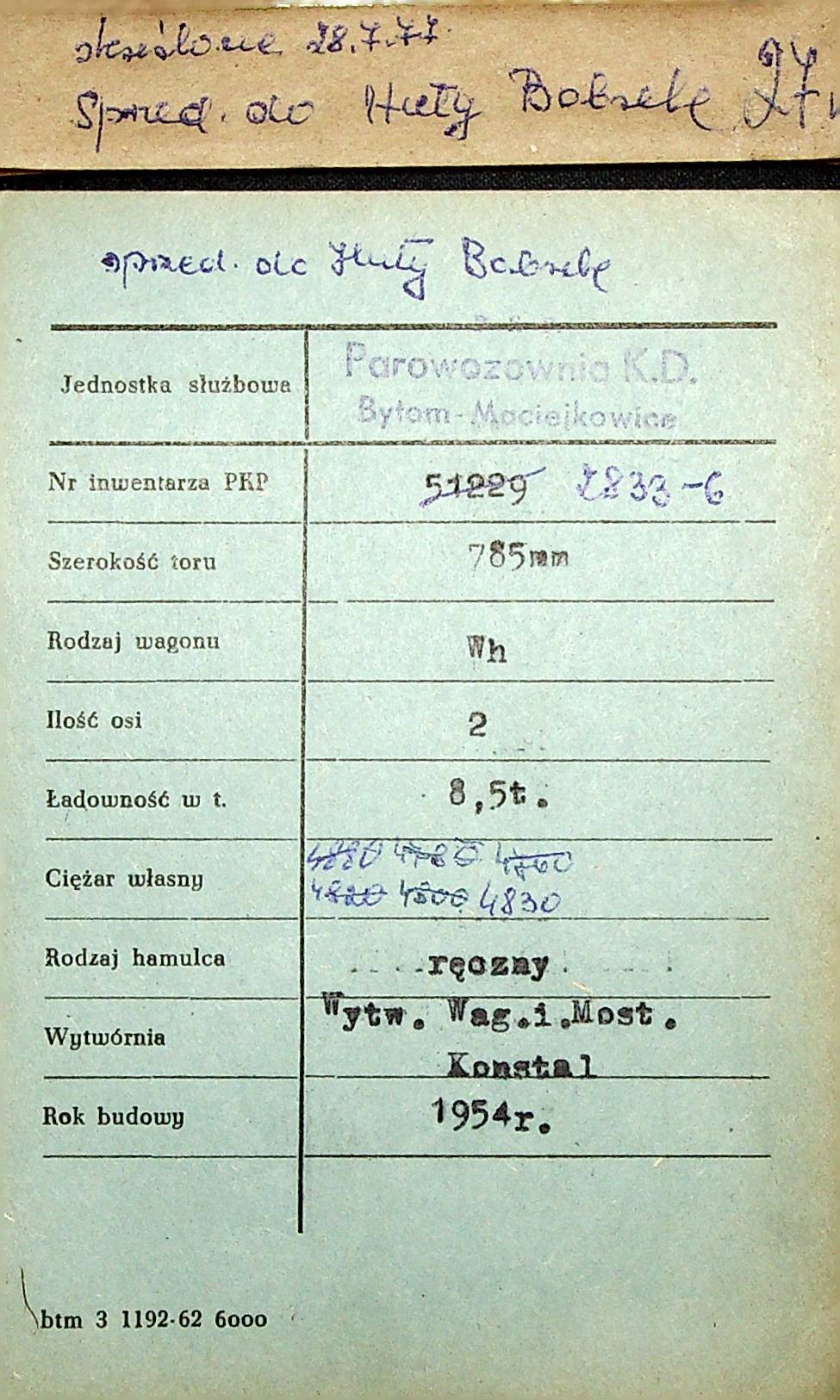 Karta wagonu Górnośląskich Kolei Wąskotorowych |