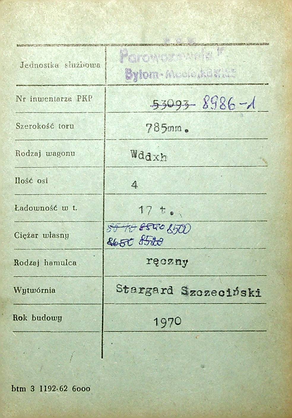 Karta wagonu Górnośląskich Kolei Wąskotorowych |