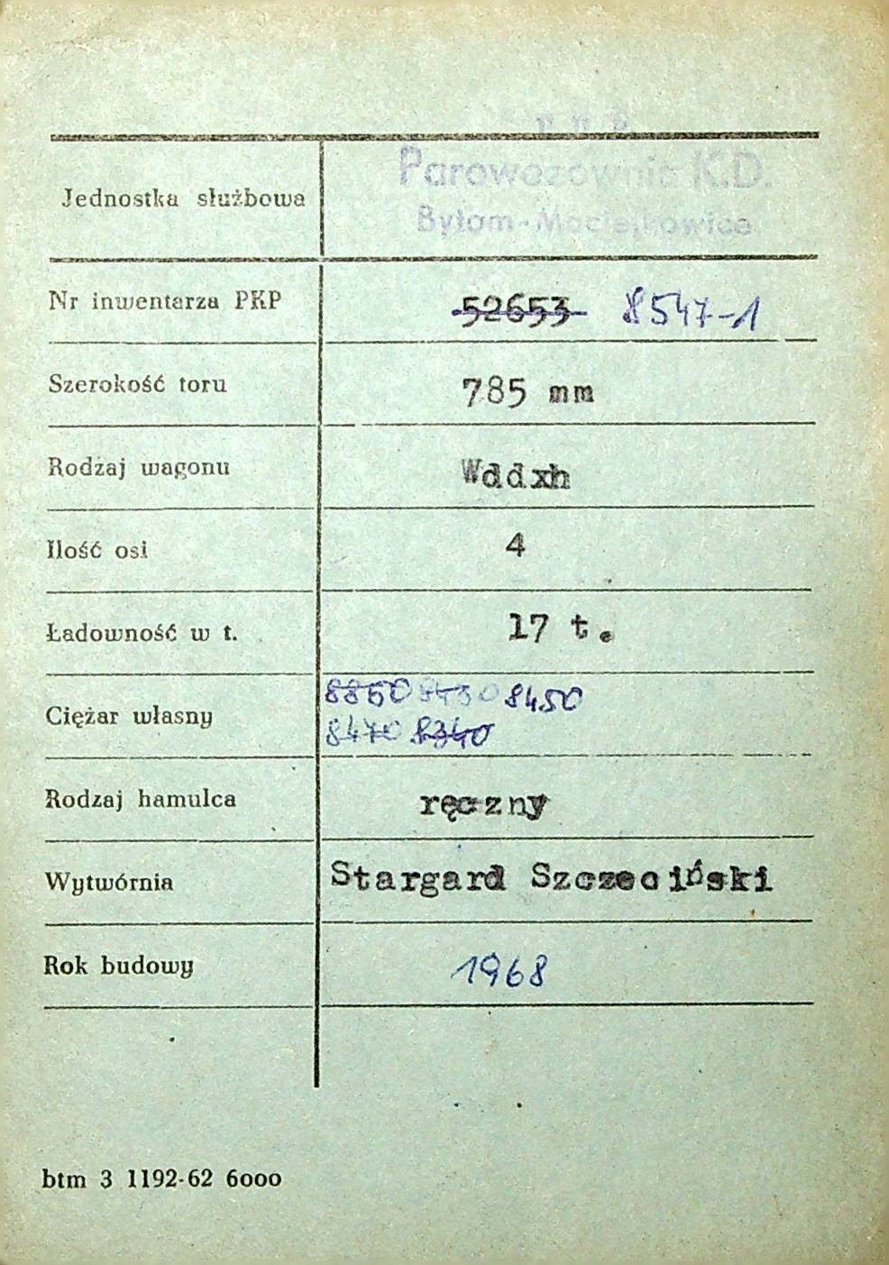 Karta wagonu Górnośląskich Kolei Wąskotorowych |