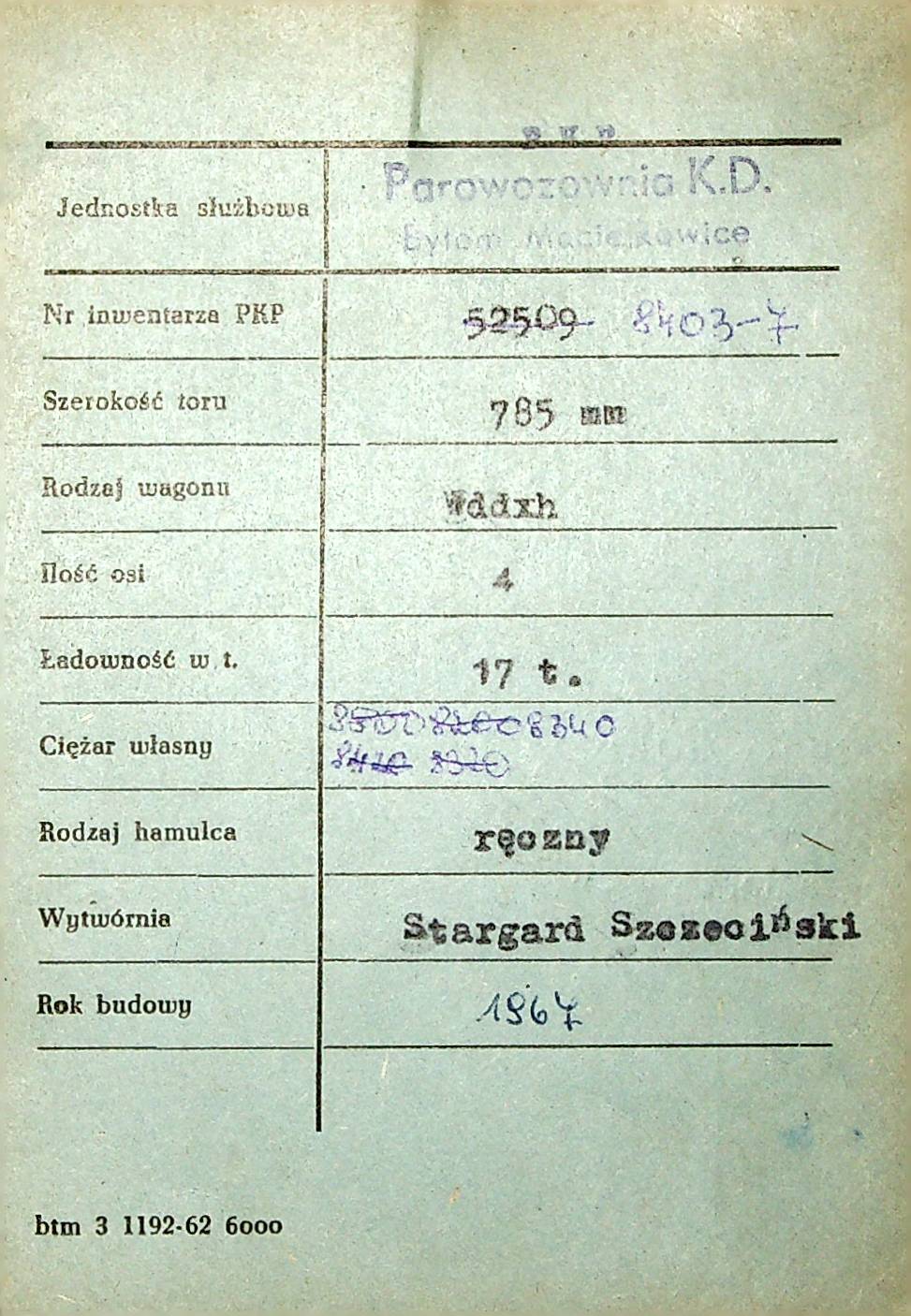 Karta wagonu Górnośląskich Kolei Wąskotorowych |
