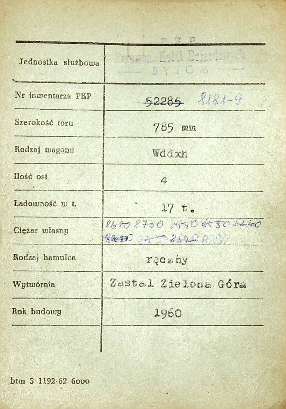 Karta wagonu Górnośląskich Kolei Wąskotorowych |