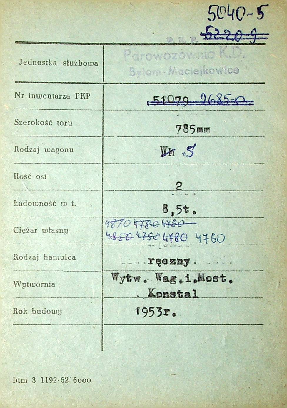 Karta wagonu Górnośląskich Kolei Wąskotorowych |