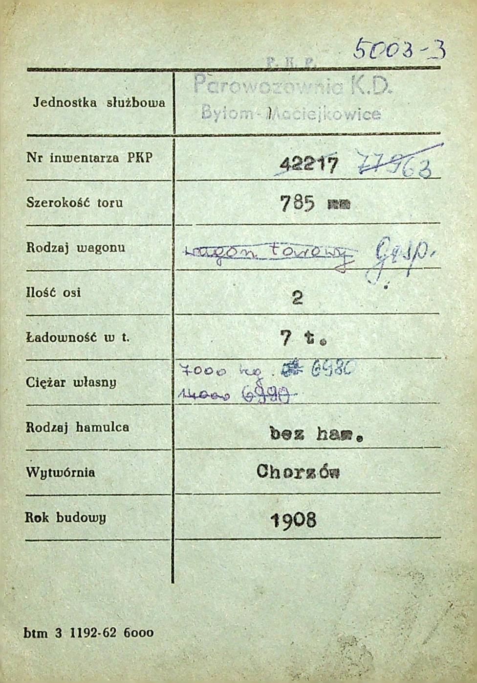 Karta wagonu Górnośląskich Kolei Wąskotorowych |