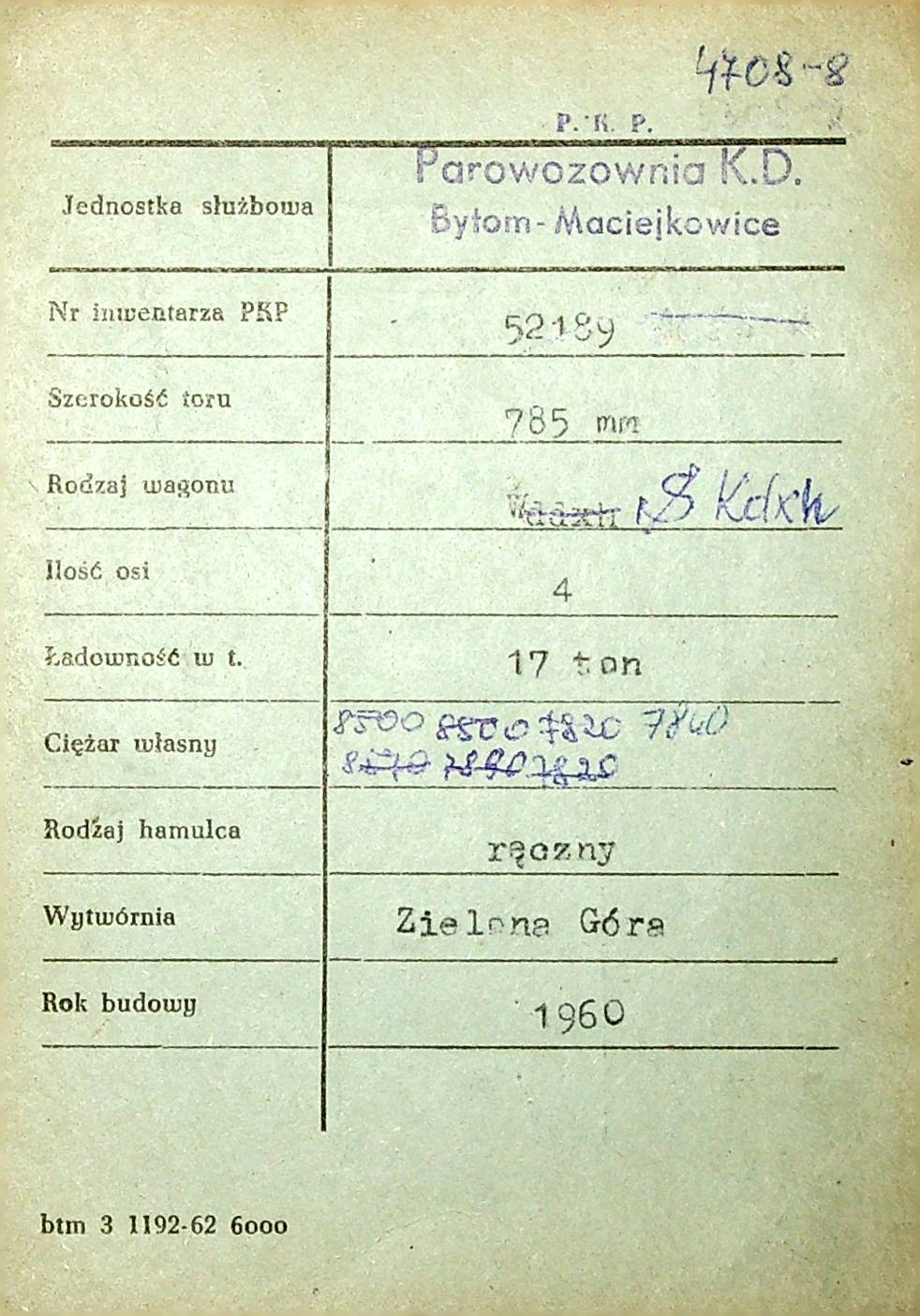 Karta wagonu Górnośląskich Kolei Wąskotorowych |