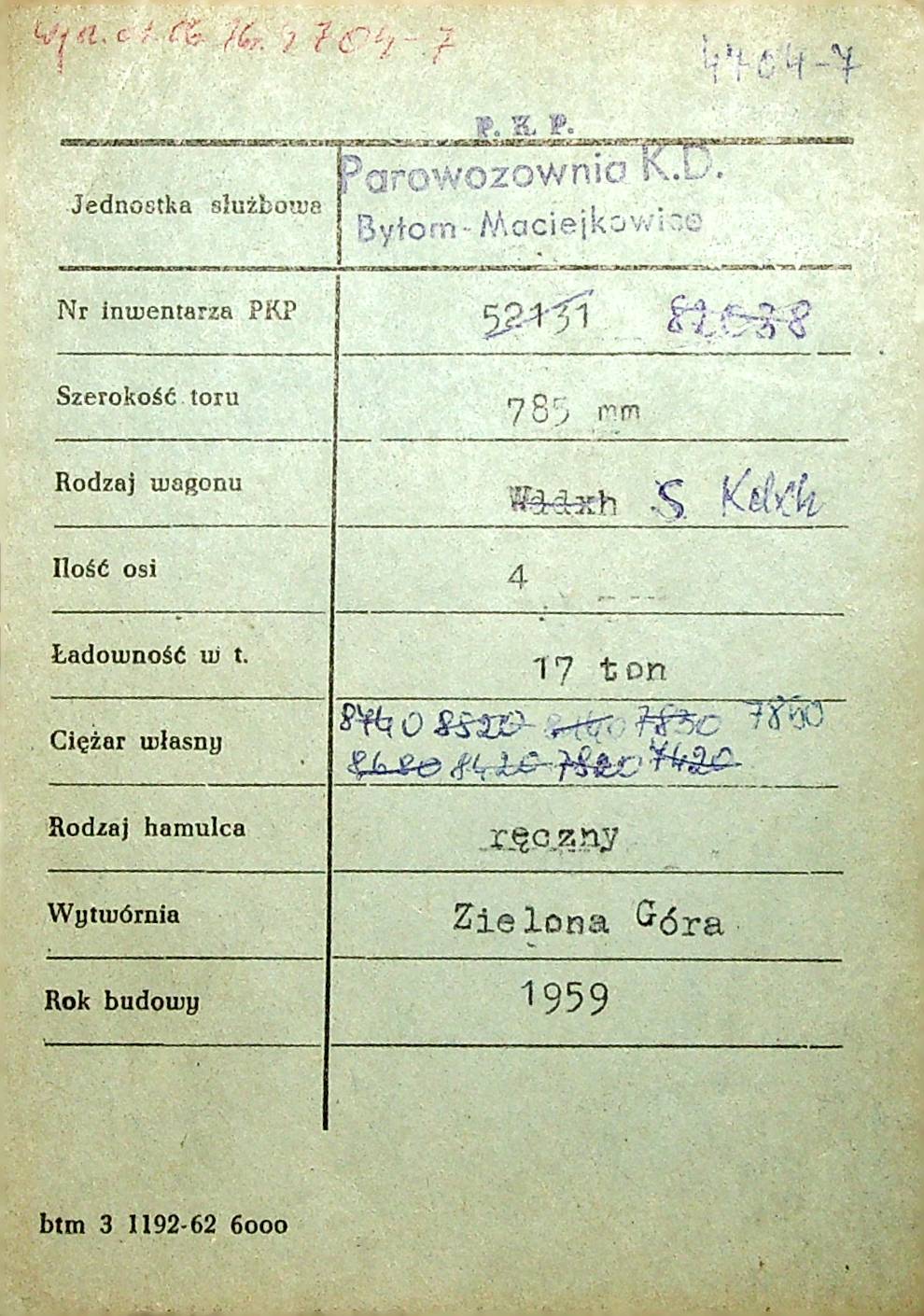 Karta wagonu Górnośląskich Kolei Wąskotorowych |