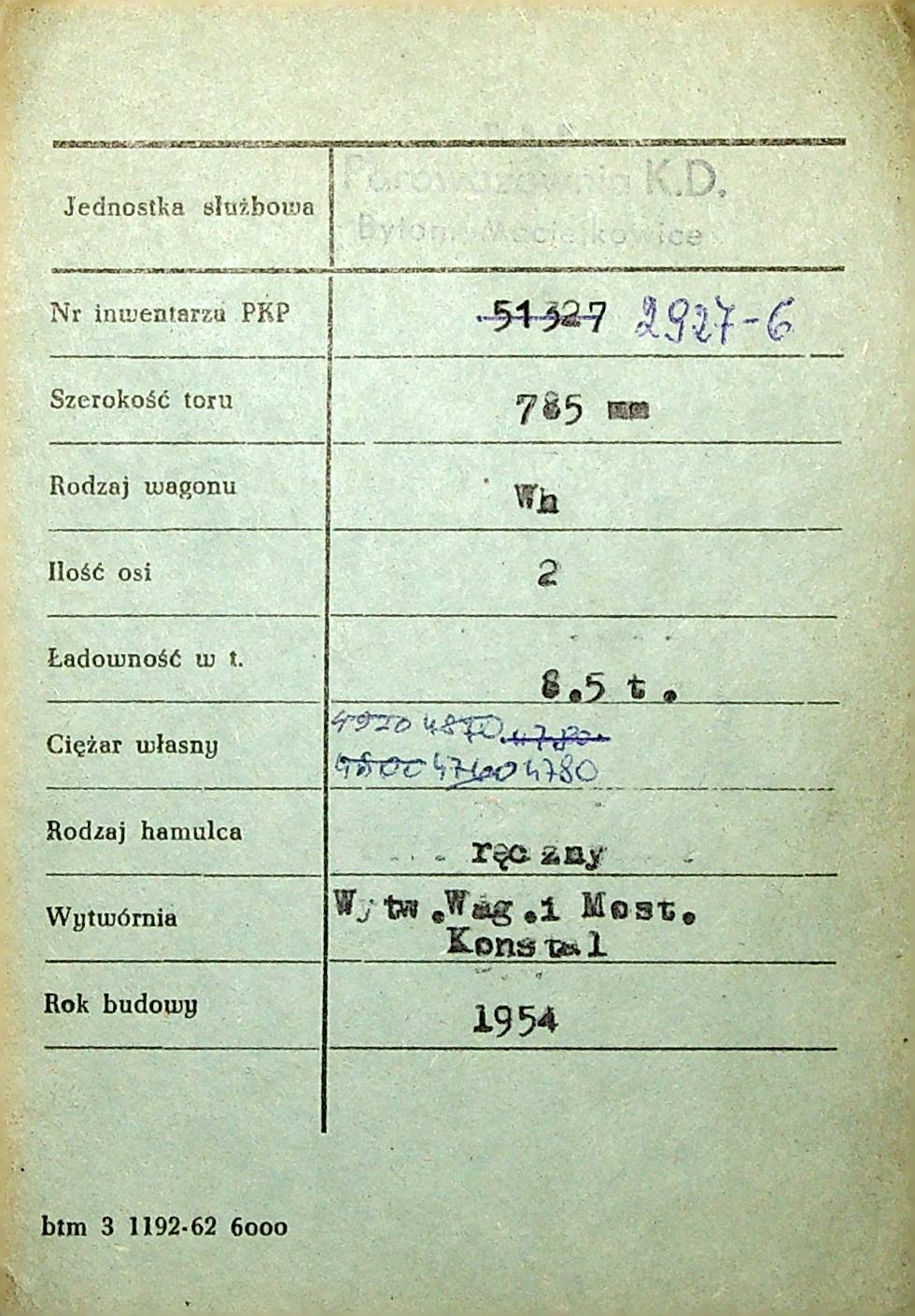 Karta wagonu Górnośląskich Kolei Wąskotorowych |