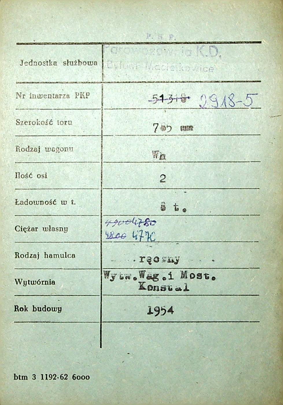 Karta wagonu Górnośląskich Kolei Wąskotorowych |