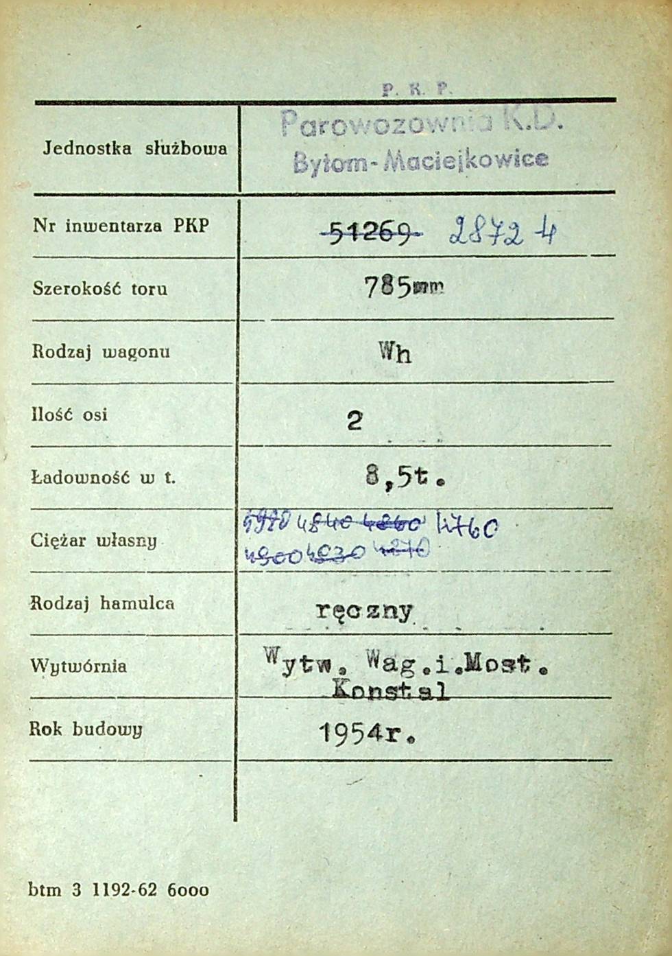 Karta wagonu Górnośląskich Kolei Wąskotorowych |