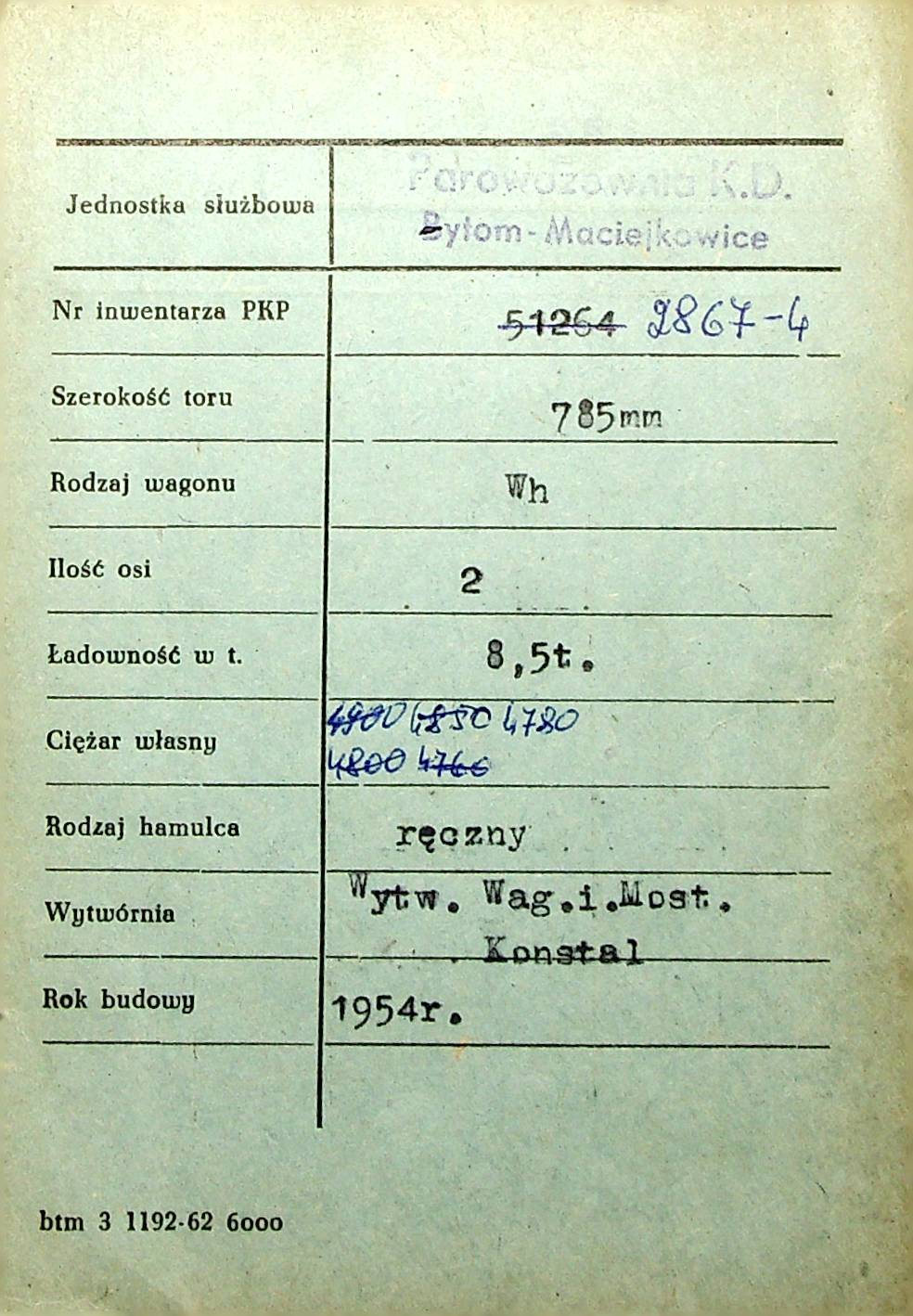 Karta wagonu Górnośląskich Kolei Wąskotorowych |