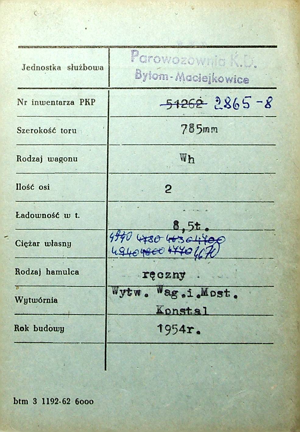 Karta wagonu Górnośląskich Kolei Wąskotorowych |