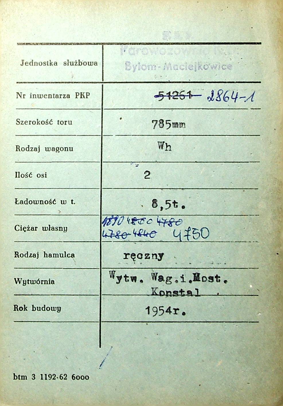 Karta wagonu Górnośląskich Kolei Wąskotorowych |