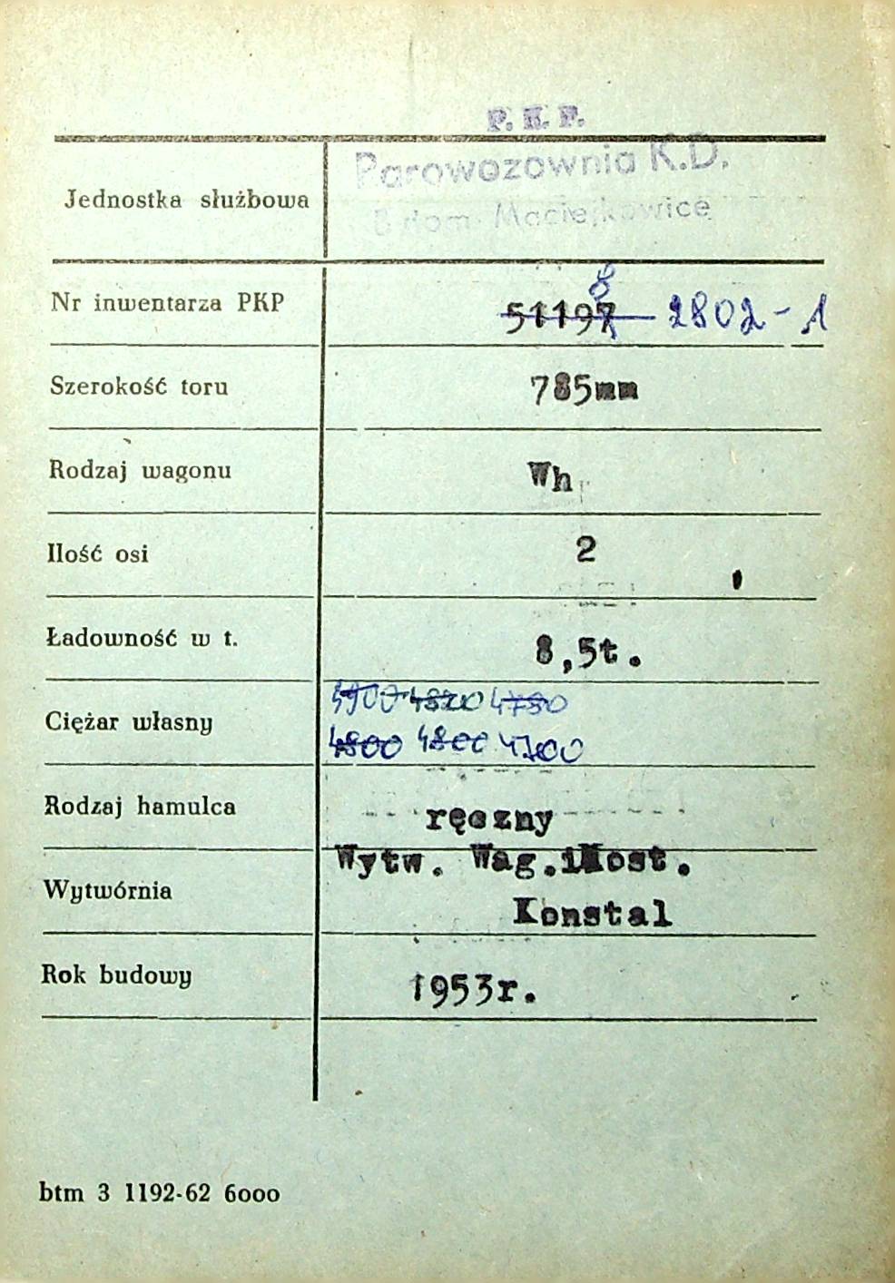 Karta wagonu Górnośląskich Kolei Wąskotorowych |