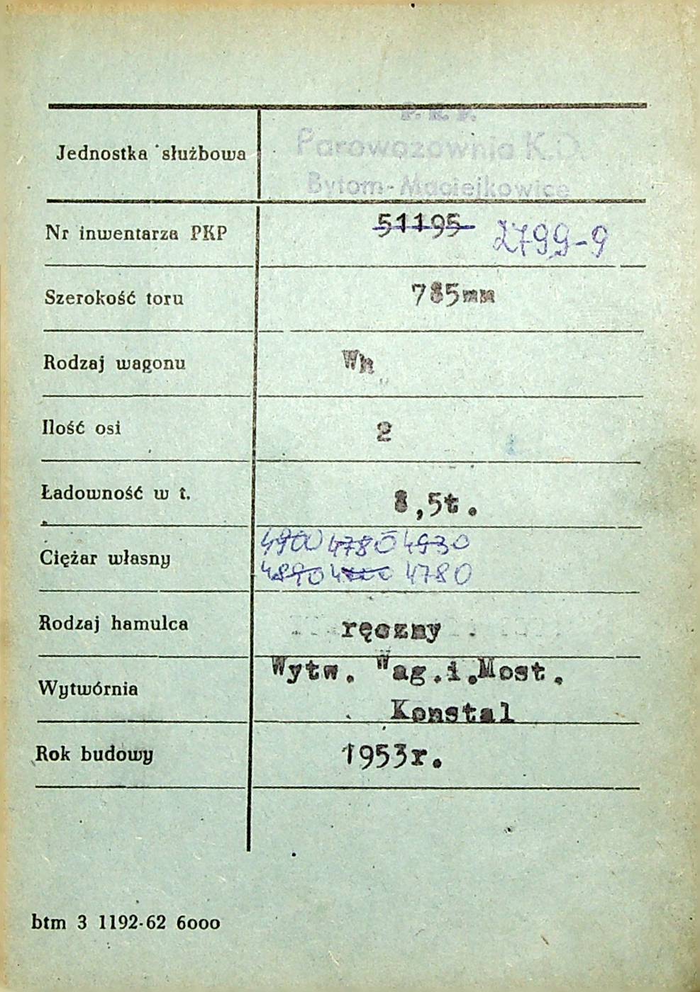 Karta wagonu Górnośląskich Kolei Wąskotorowych |