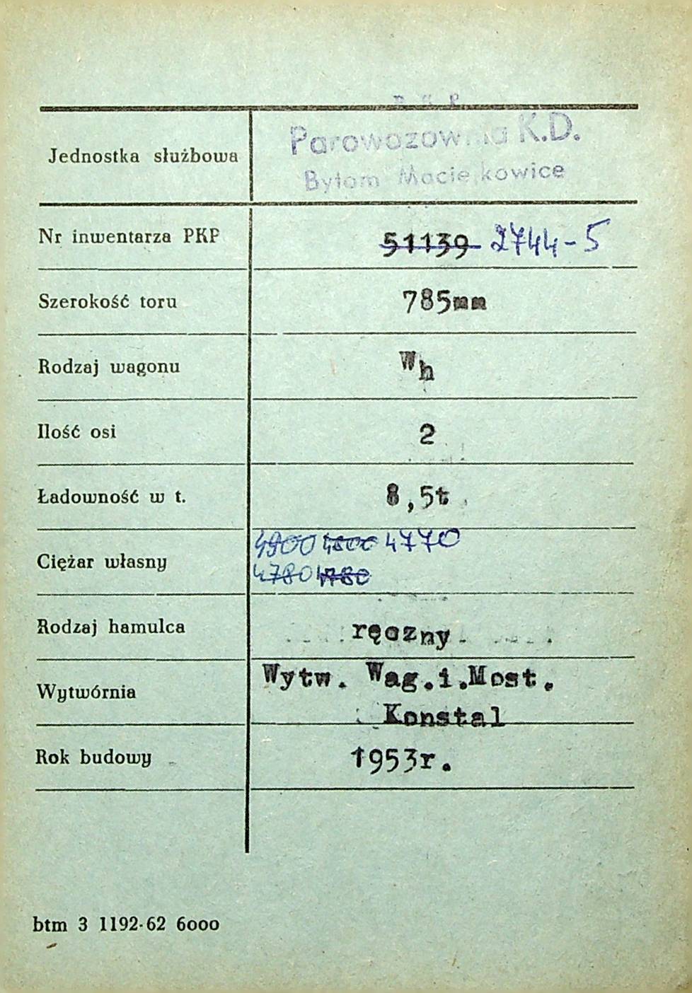 Karta wagonu Górnośląskich Kolei Wąskotorowych |