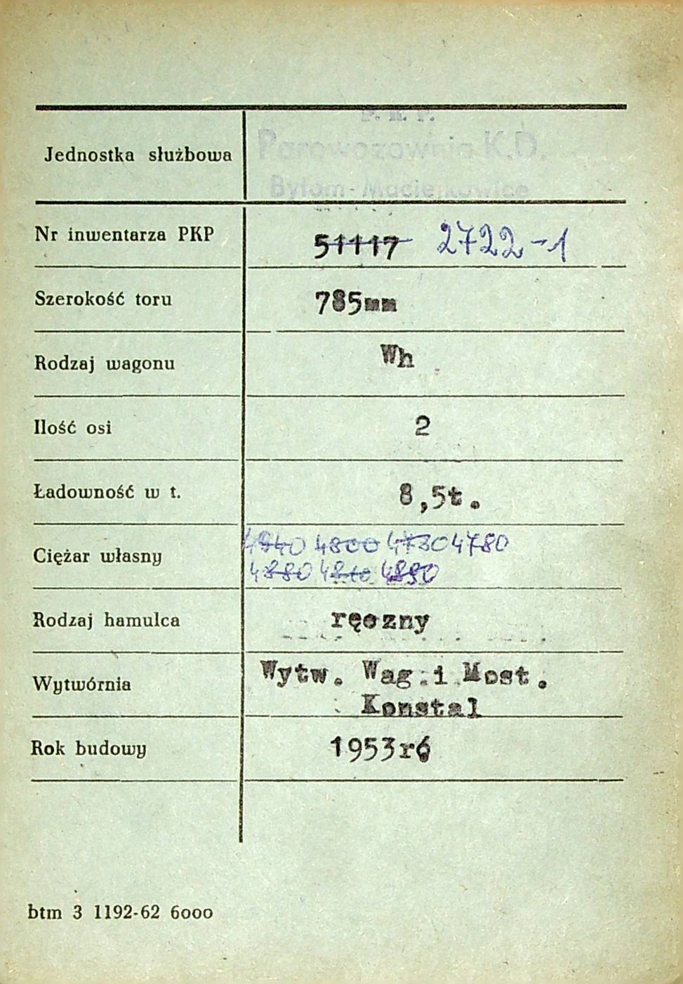 Karta wagonu Górnośląskich Kolei Wąskotorowych |