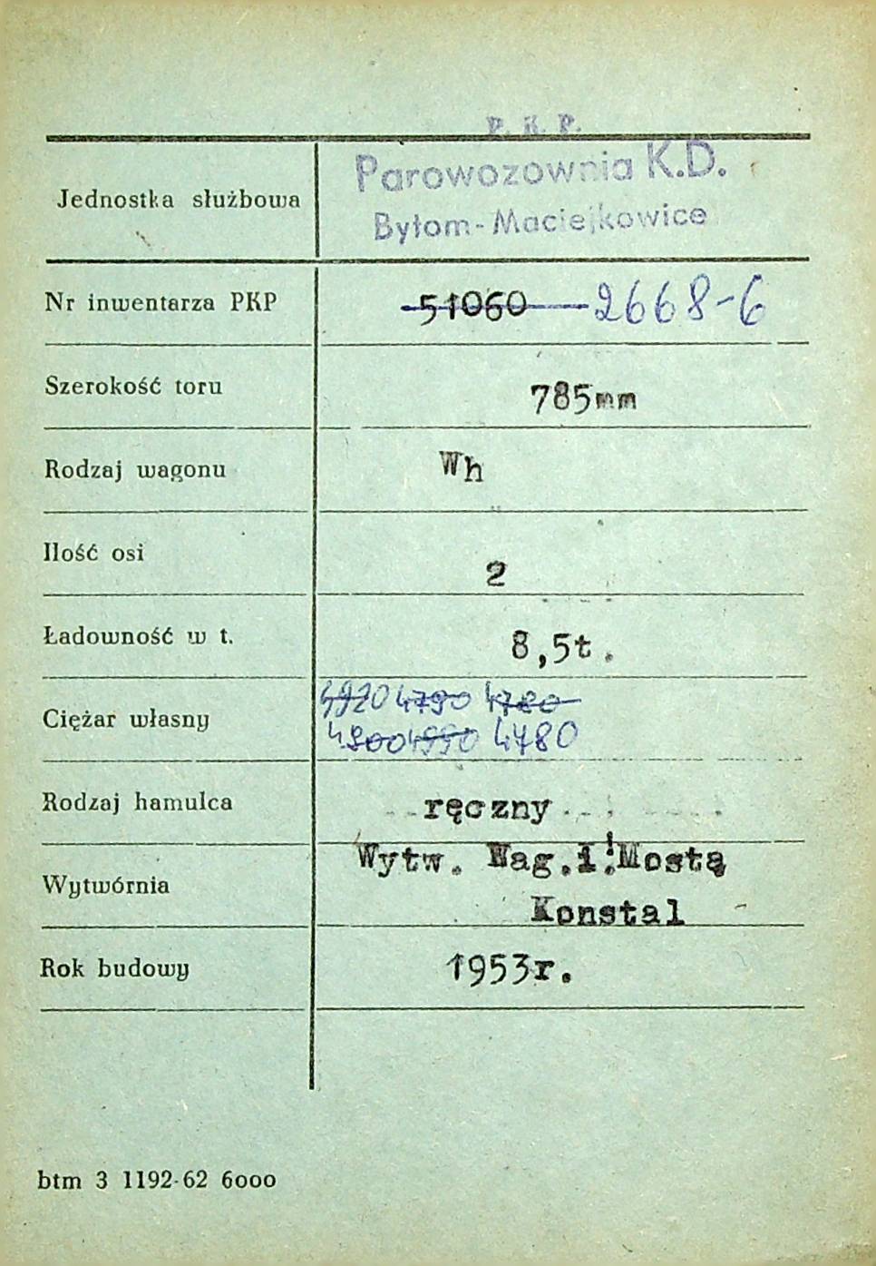 Karta wagonu Górnośląskich Kolei Wąskotorowych |