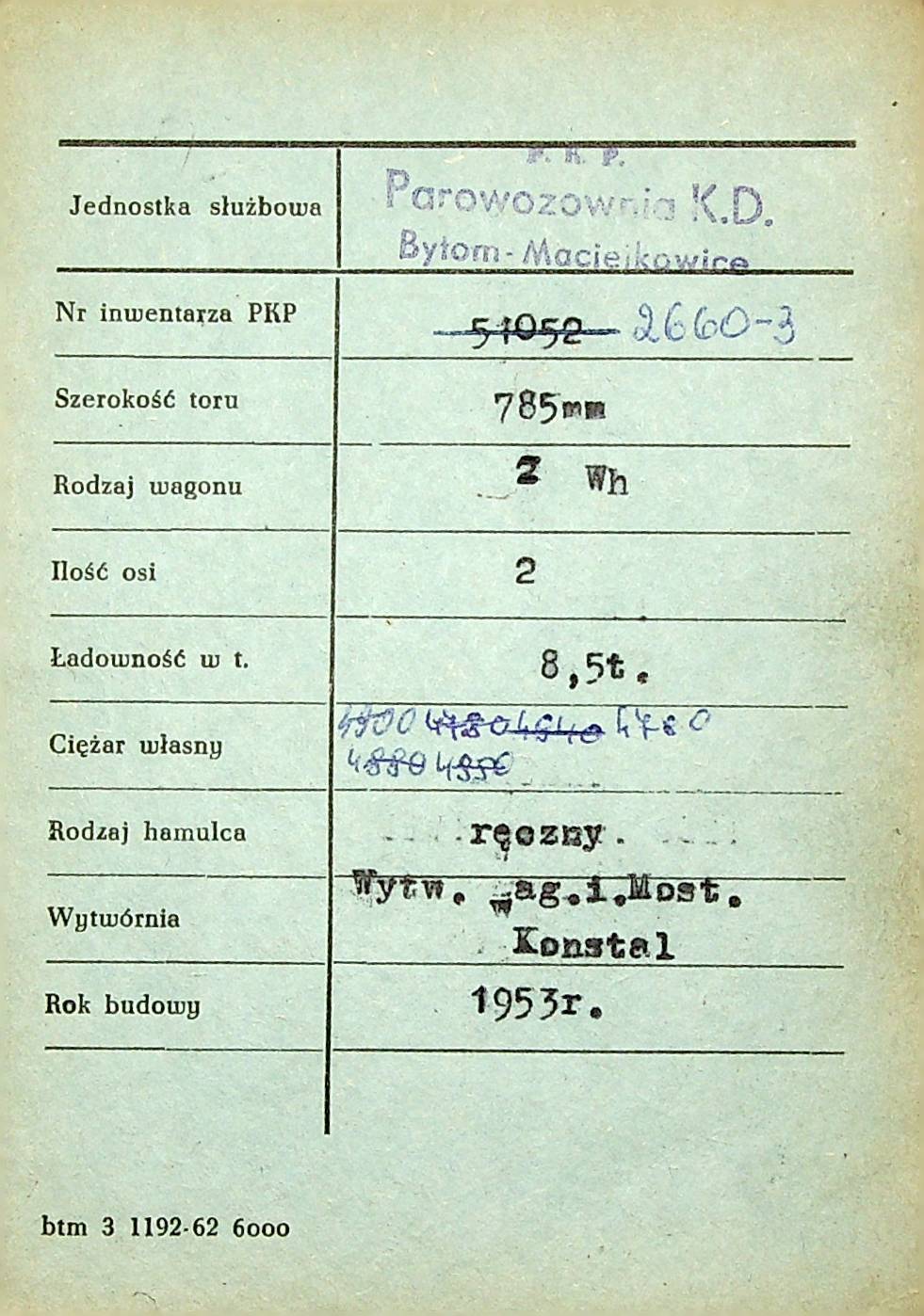 Karta wagonu Górnośląskich Kolei Wąskotorowych |