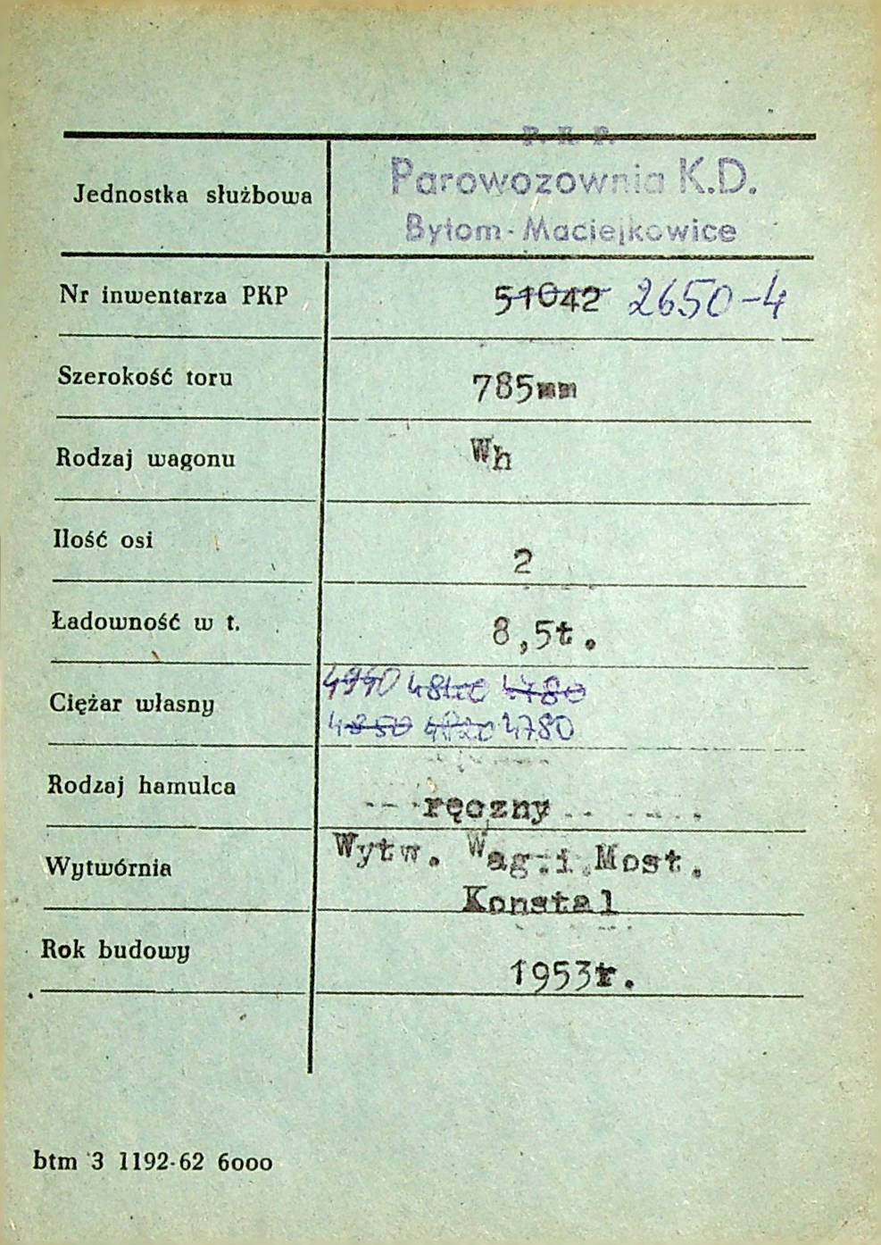Karta wagonu Górnośląskich Kolei Wąskotorowych |
