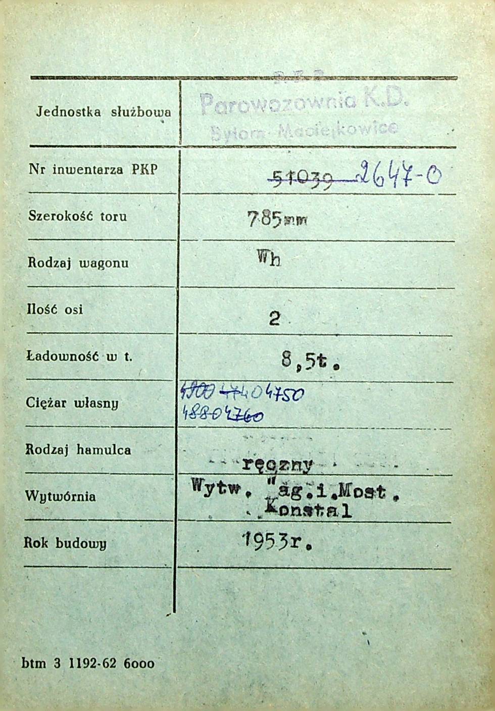 Karta wagonu Górnośląskich Kolei Wąskotorowych |