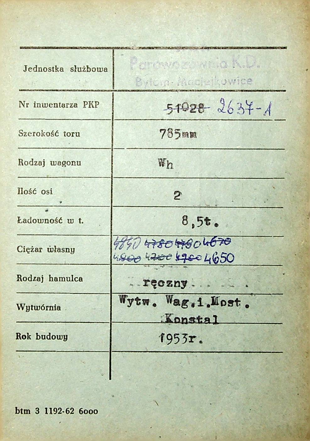 Karta wagonu Górnośląskich Kolei Wąskotorowych |
