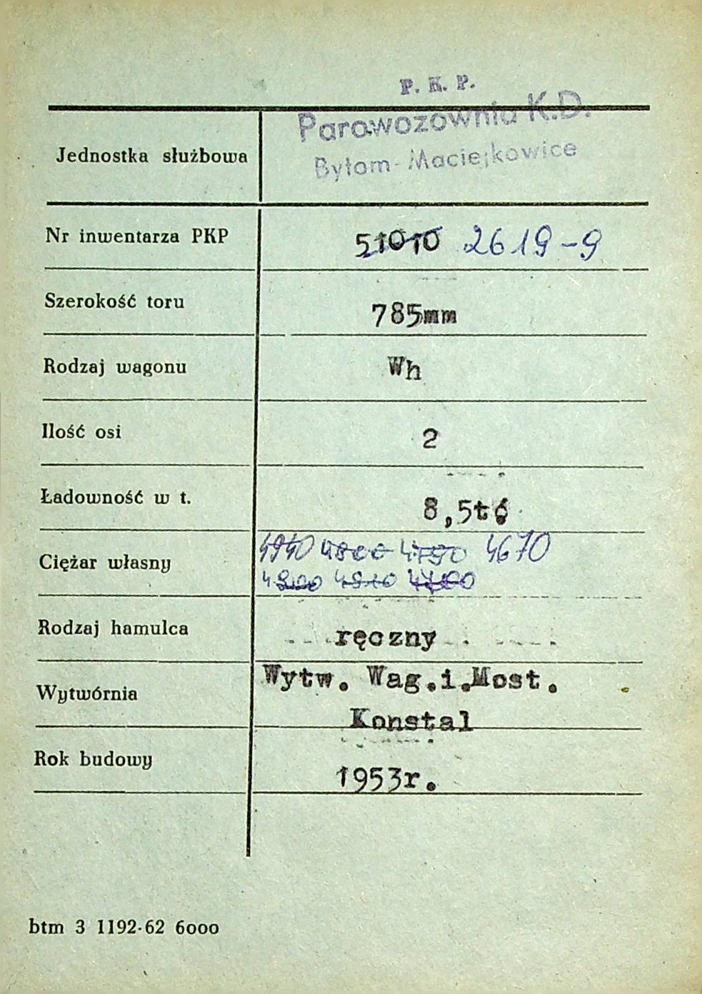 Karta wagonu Górnośląskich Kolei Wąskotorowych |