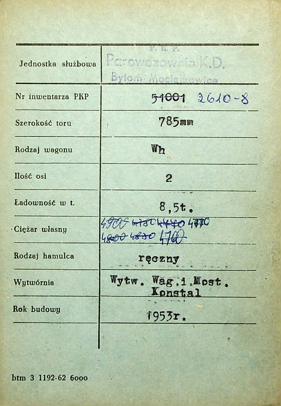 Karta wagonu Górnośląskich Kolei Wąskotorowych |