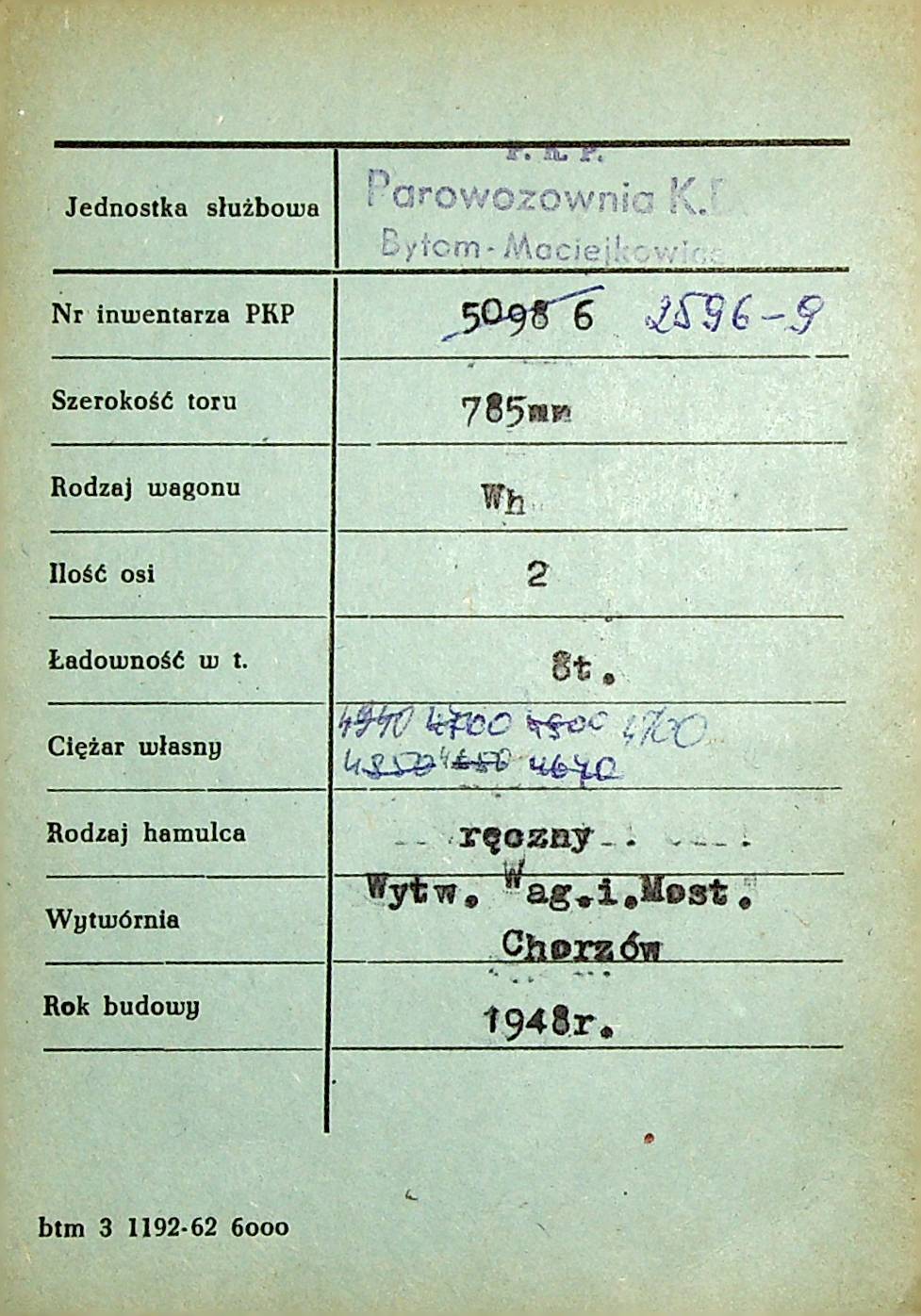 Karta wagonu Górnośląskich Kolei Wąskotorowych |