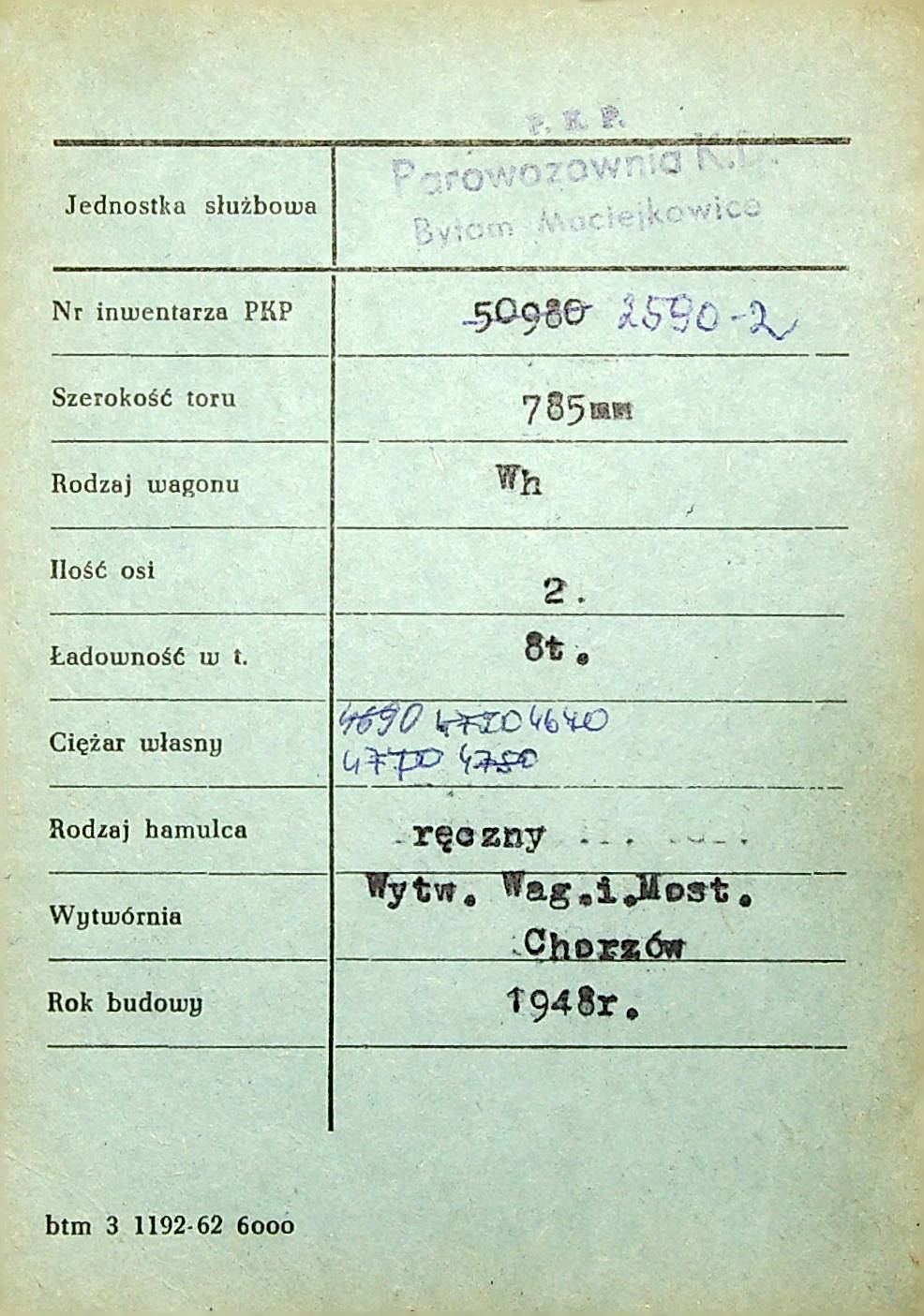Karta wagonu Górnośląskich Kolei Wąskotorowych |