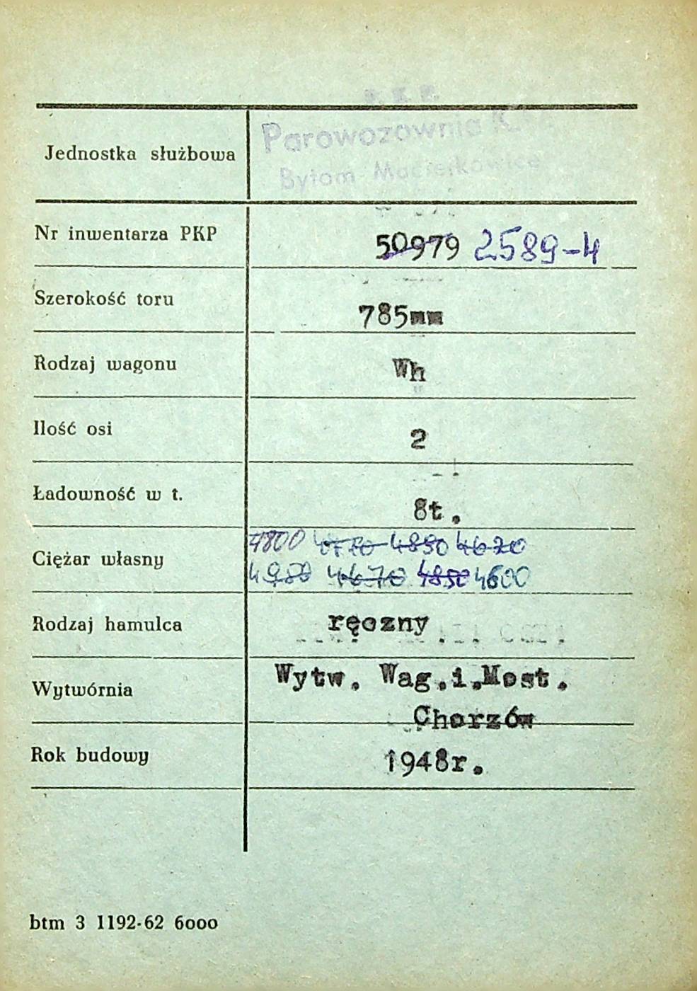 Karta wagonu Górnośląskich Kolei Wąskotorowych |