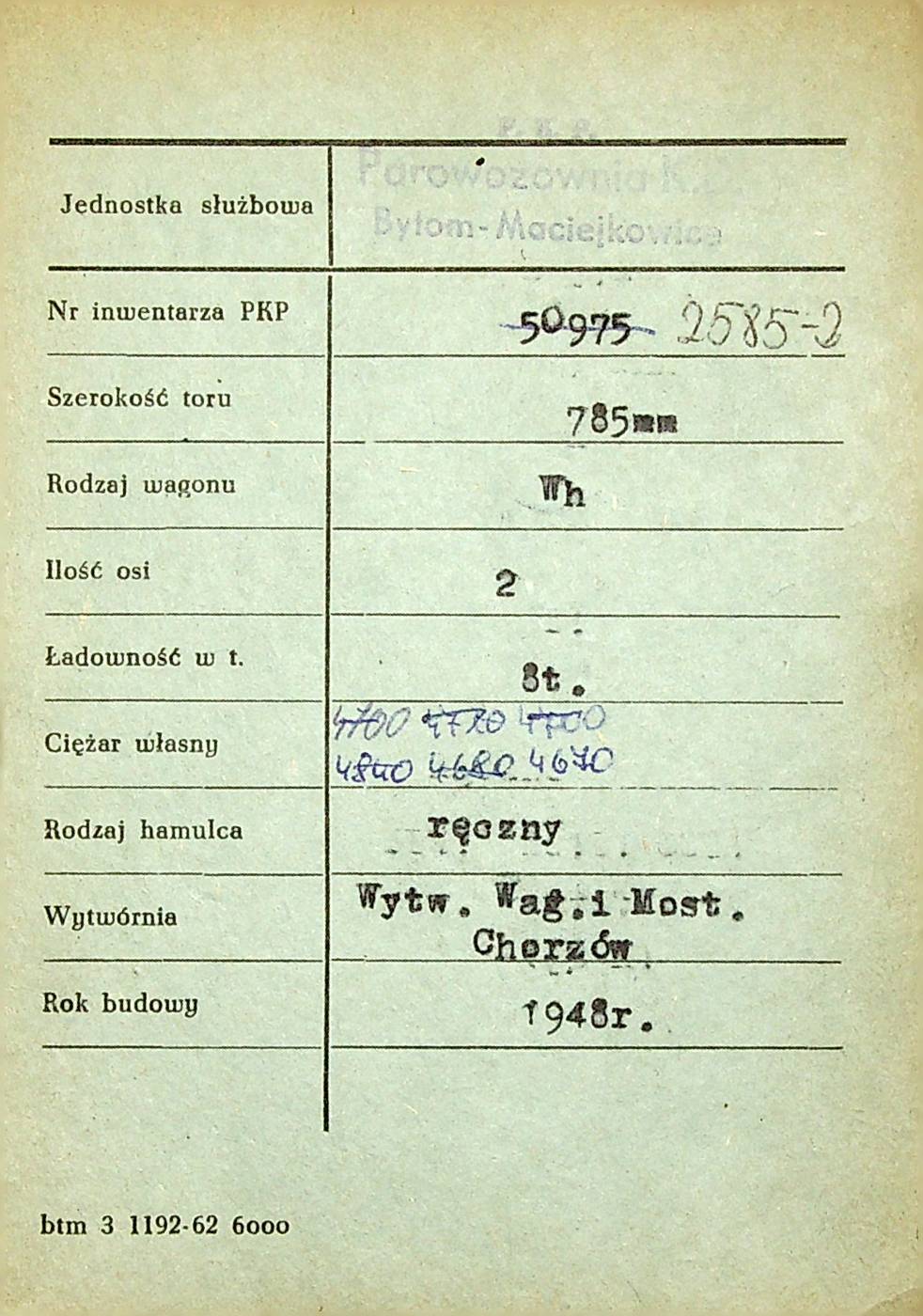 Karta wagonu Górnośląskich Kolei Wąskotorowych |