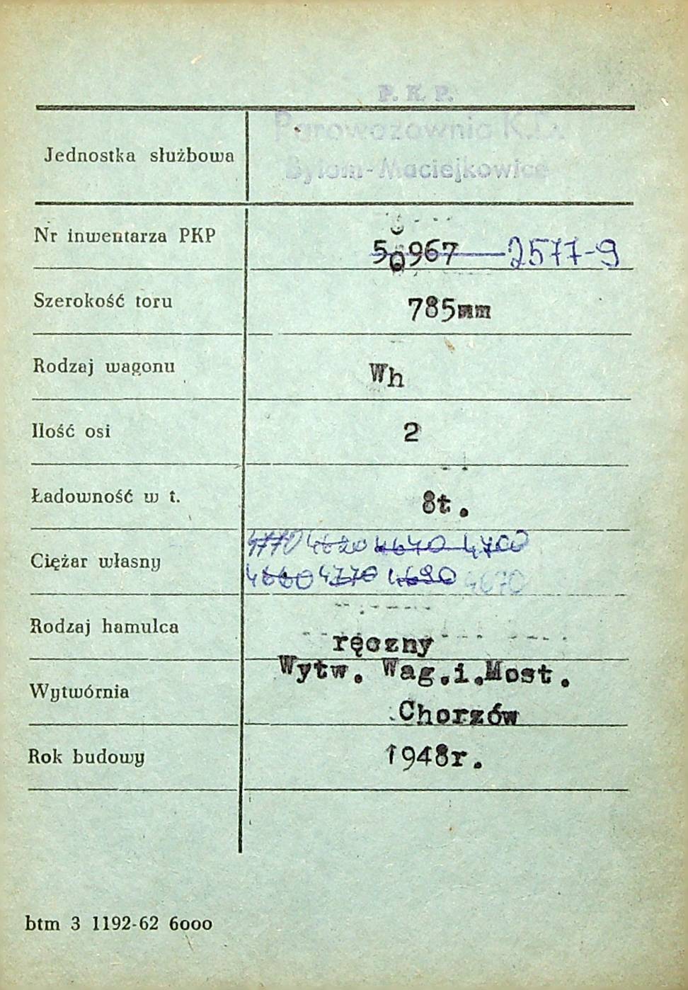 Karta wagonu Górnośląskich Kolei Wąskotorowych |