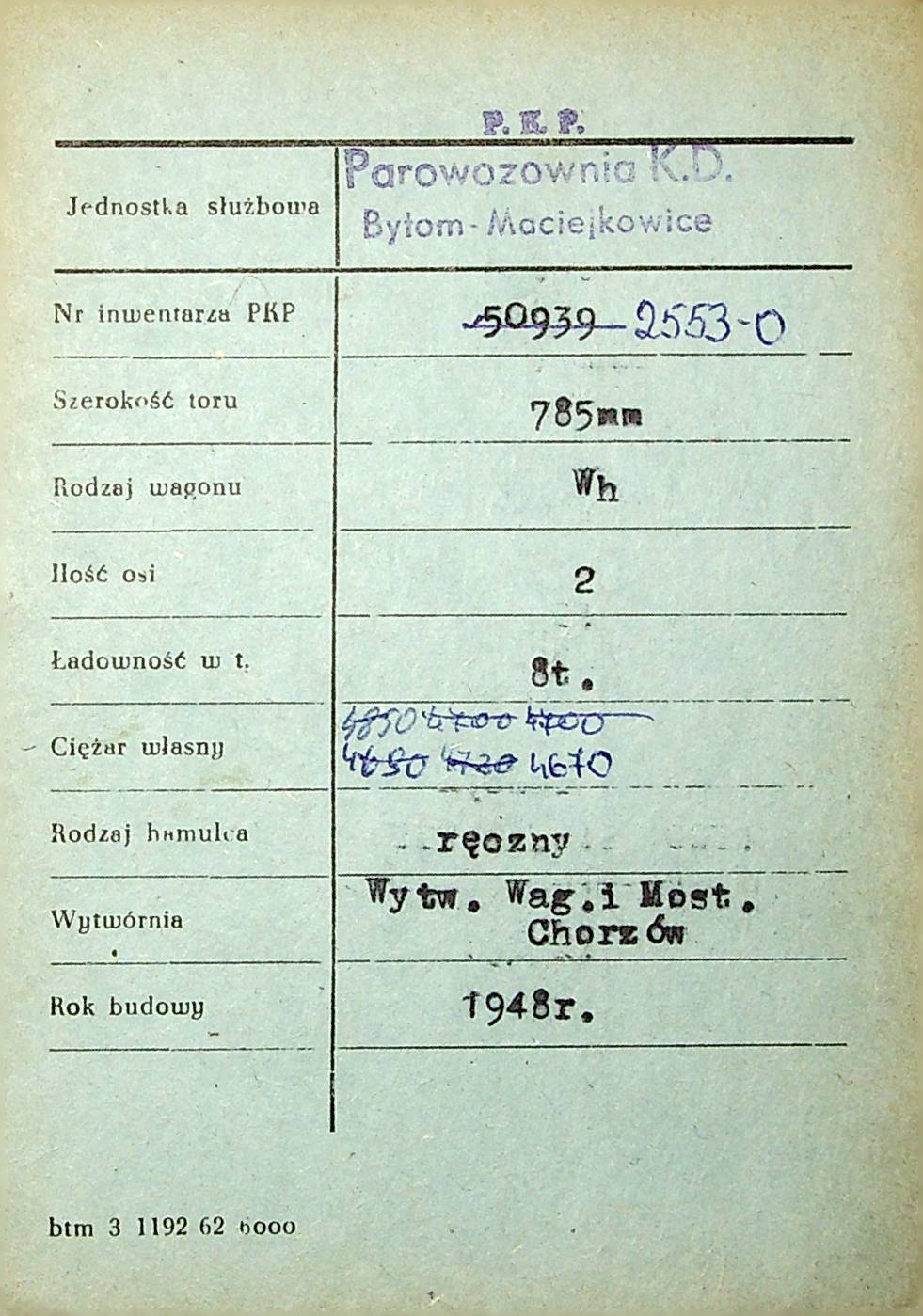 Karta wagonu Górnośląskich Kolei Wąskotorowych |